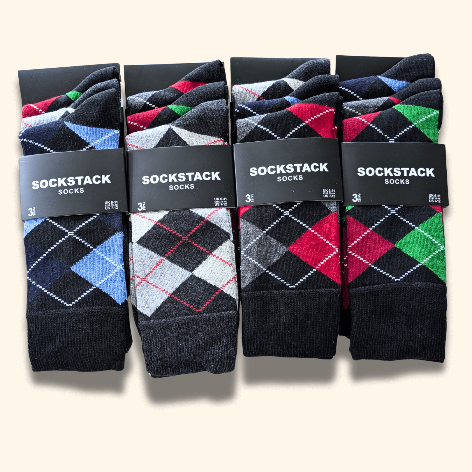 12 Pairs Men's Soft Cotton Colourful Heel Toe Black Argyle Diamond Easycare Comfortable Shoe Socks Flat Toe Seam Durable Work School Business Wear UK 6-11 by Sock Stack