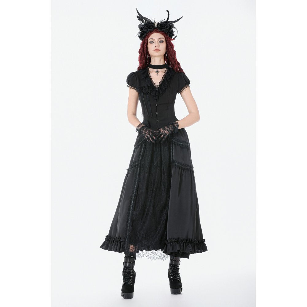 A sweeping silhouette with Victorian soul—the Belladonna Floor-Length Goth Skirt by Dark in Love is a hauntingly elegant masterpiece of layered lace and draped detailing. Crafted entirely from flowing black polyester, it offers a semi-sheer lace panel at the front framed by ruffles and ruching, while the hem is trimmed with fluttering frills. Adjustable waist ties allow for a flexible fit, and the trailing length adds theatrical impact to any gothic wardrobe.