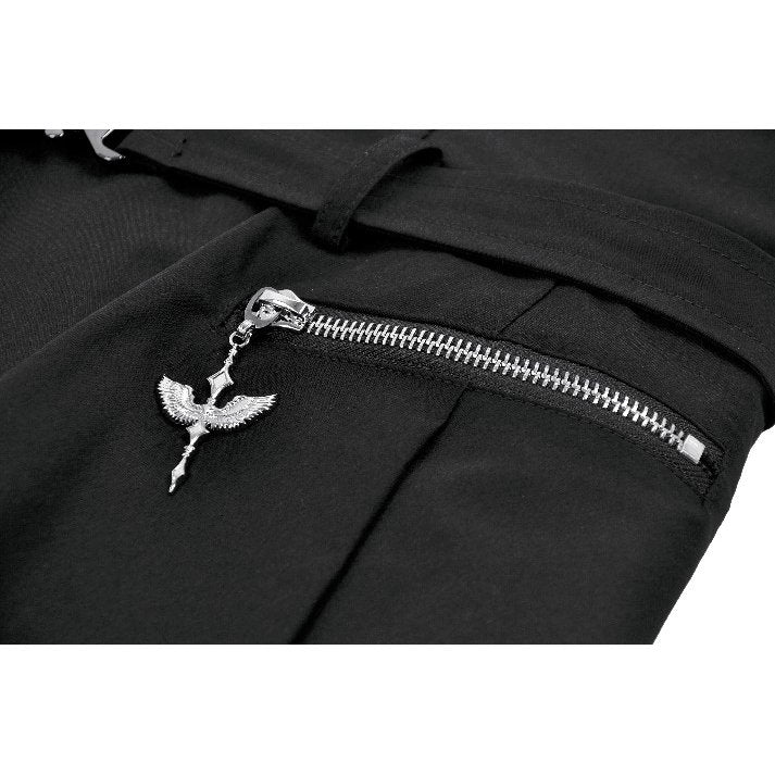 Details like the integrated belt with gothic O-ring charm, faux zipper detail, and mock mandarin collar push this piece into statement territory. The hidden side zip allows for easy wear while maintaining a structured silhouette, making this a versatile dress for layering or solo wear.