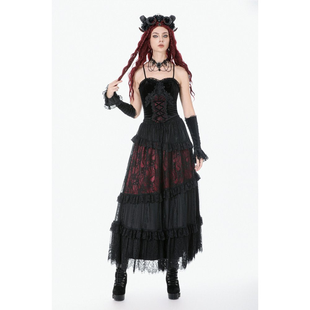 A sweeping lace maxi skirt with a blood-dark splice beneath the black layers—made for moonlit movement and gothic drama.