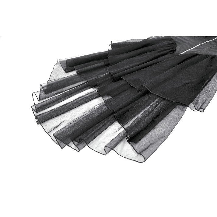 The layered tulle skirt cascades down in hauntingly beautiful tiers, blending sheer mesh with daring asymmetry for maximum impact. A central zip closure ensures ease of wear, while the form-fitting bodice enhances your curves with precision.