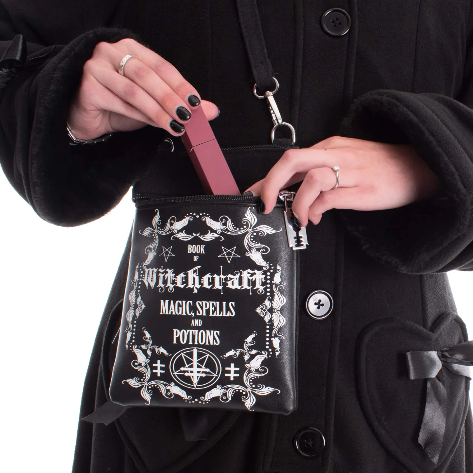Get ready to cast some serious style spells with our Heartless Witchcraft Shoulder Bag! This black bag features a Book of Witchcraft print and clever razor blade zip pulls. With plenty of room to carry your essentials, this bag will definitely leave a lasting impression.