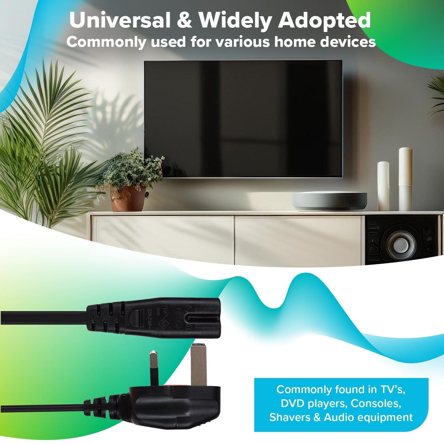 The Maplin Power Lead IEC C7 Fig 8 2 Pin Plug to UK 3 Pin Plug, also known as a figure 8 lead, is commonly used for low powered appliances such as portable TVs, set-top boxes, and some laptop power supplies. The PVC connectors are moulded to provide a high-quality cable that is perfect for home and office use. Most of the SKY boxes currently use this figure of 8 cables for power. The Plug is pre-fitted with a fuse.