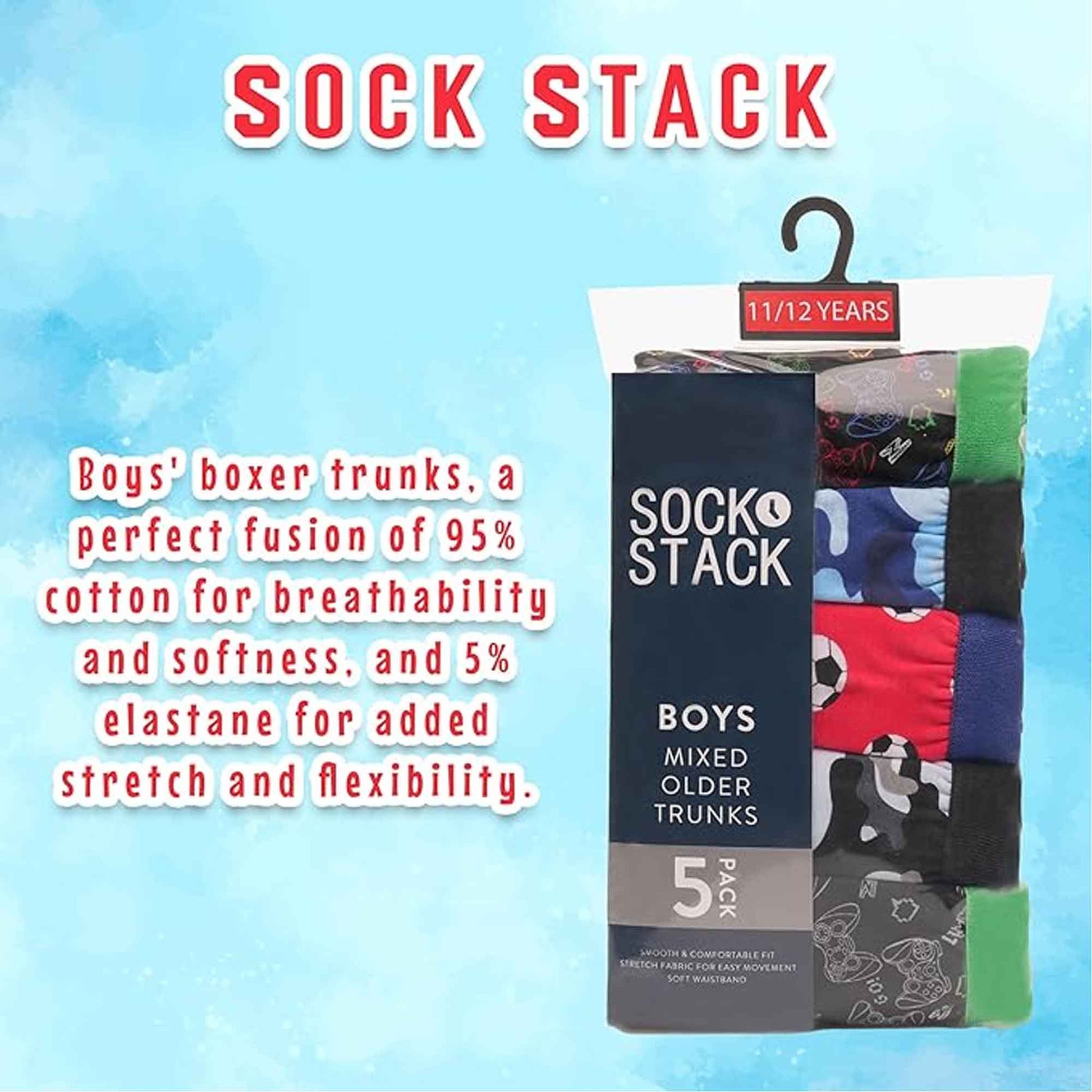 Pack of 5 Boys Boxer Shorts Cotton Rich Football Army Gamer Designs Elastic Waistband Comfortable Underwear for Active Kids by Sock Stack