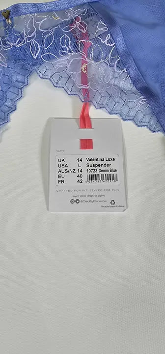 For a completely captivating look; match the Valentina Luxe Plunge and Brazilian with the brand new Valentina Luxe Suspender belt. Like its counterparts, this style features pretty gold embroidery detailing against a charming Denim Blue shade. This set is sure to cast a few enchantments!