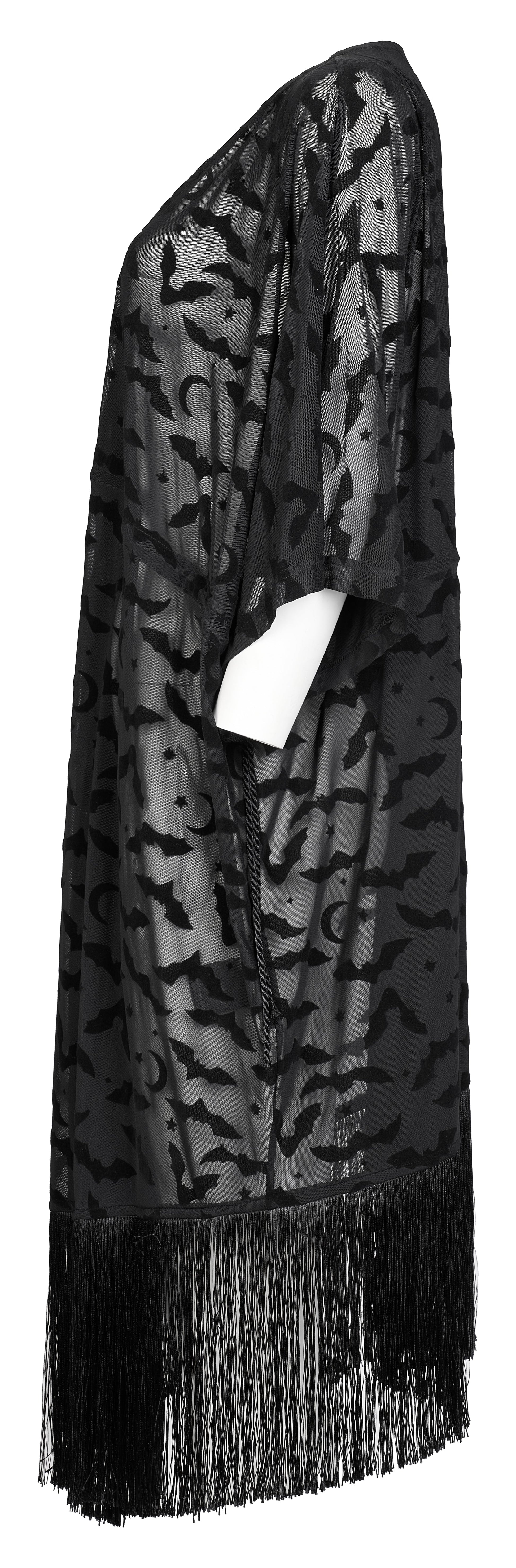This striking kimono from Punk Rave features elbow length wide sleeves and a beautiful fringed hemline. An amazing bats, moons and stars design in a luxurious velvet flocked mesh, this lovely kimono is a perfect addition to your wardrobe. Fastening with an ornate hook & eye, for the perfect fit and fabric composition, please see Punk Rave's size guide in the images.