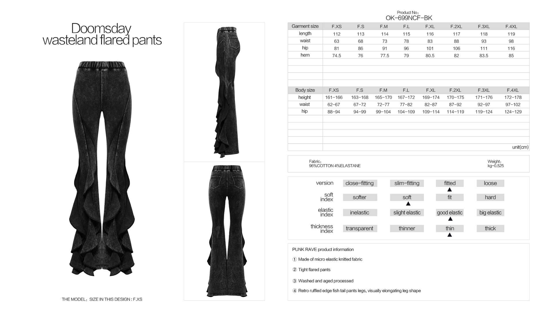 Dive into post-apocalyptic fashion with these Punk Rave Breen Doomsday Wasteland Bell Flared Trousers! Crafted from micro elastic knitted fabric, these tight flared pants hug in all the right places while giving you room to strut. The washed and aged processing gives them that perfect lived-in look, while the retro ruffled fishtail hems add a playful edge that makes your legs look miles long. Ready to rule the wasteland in style!