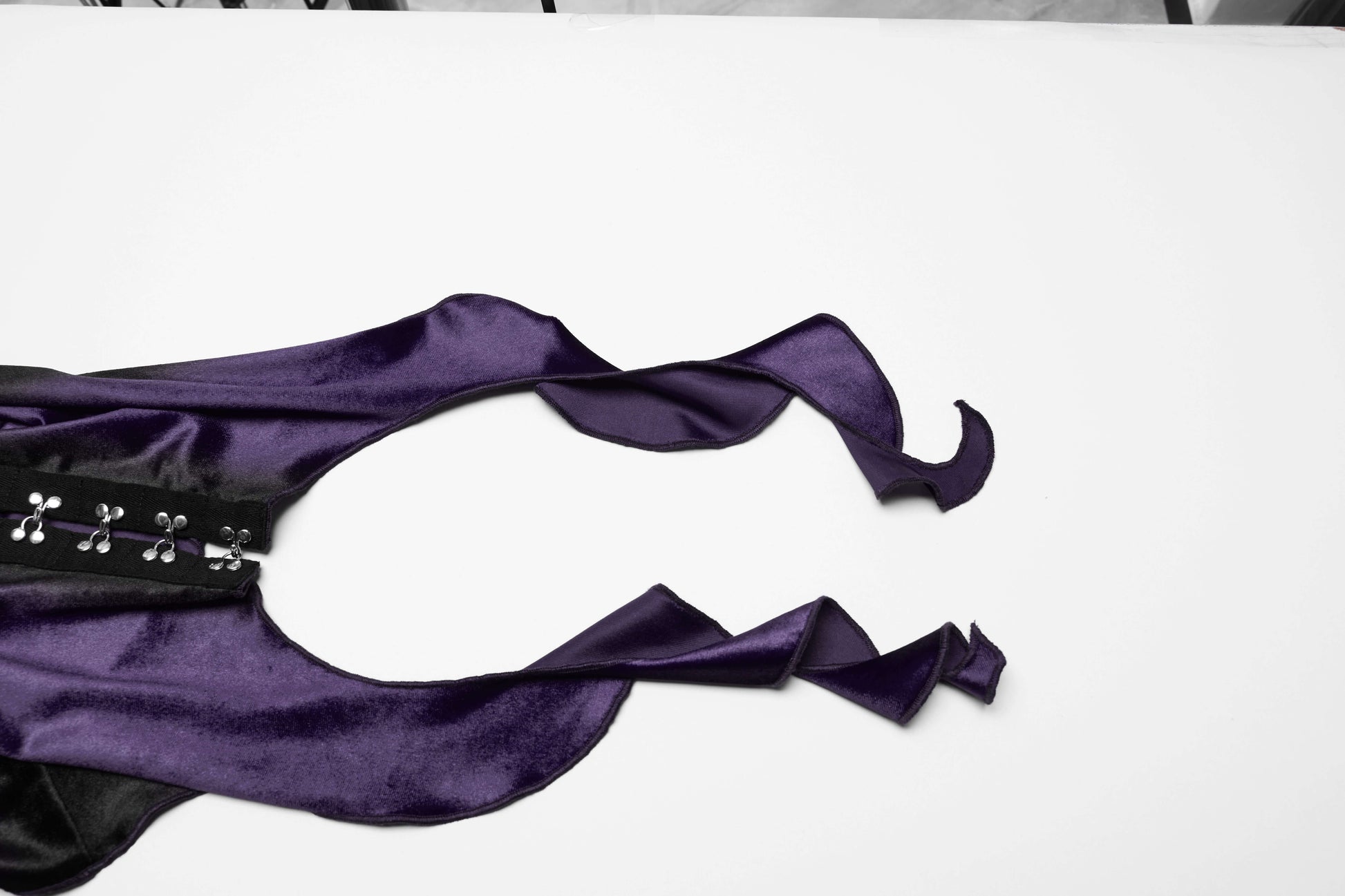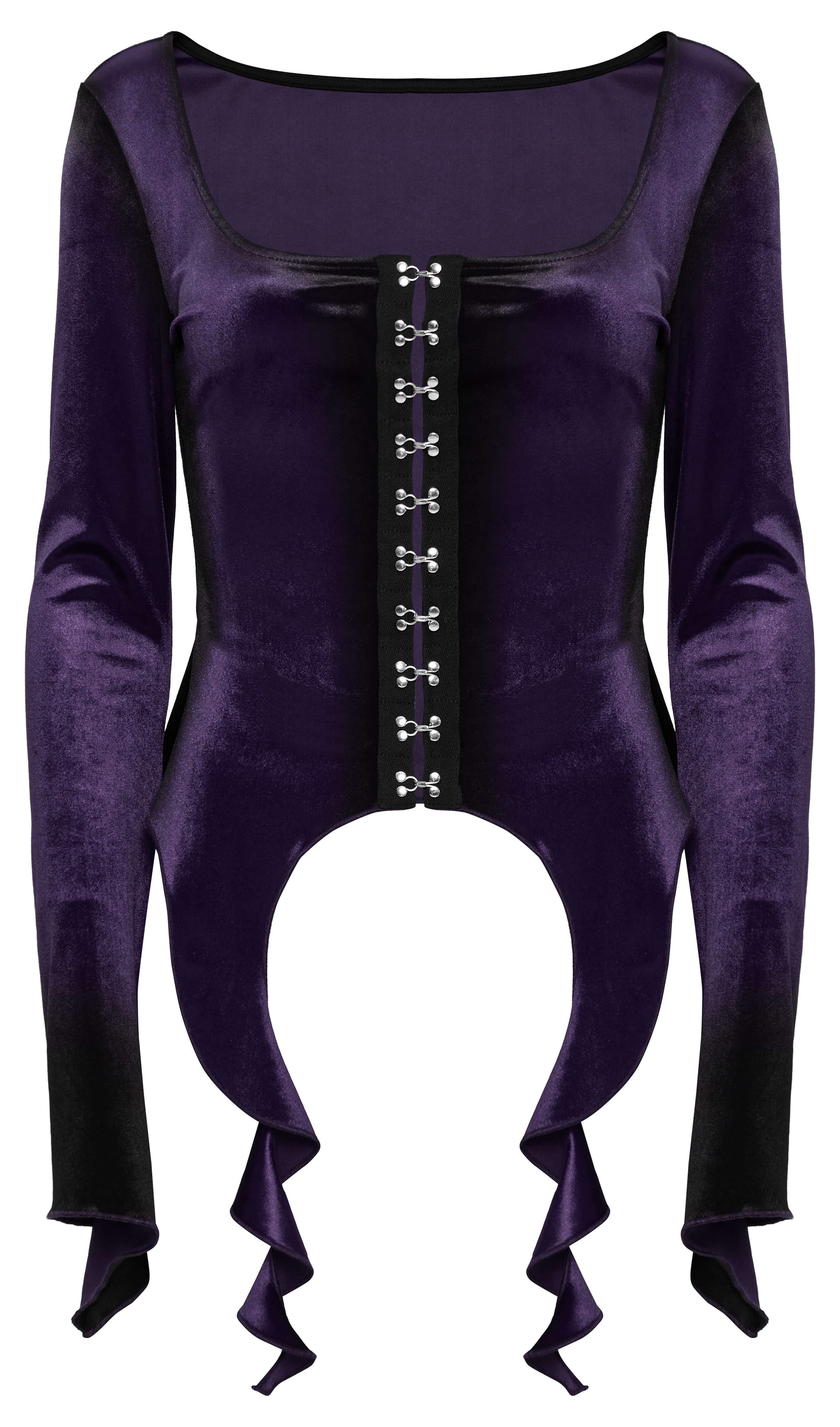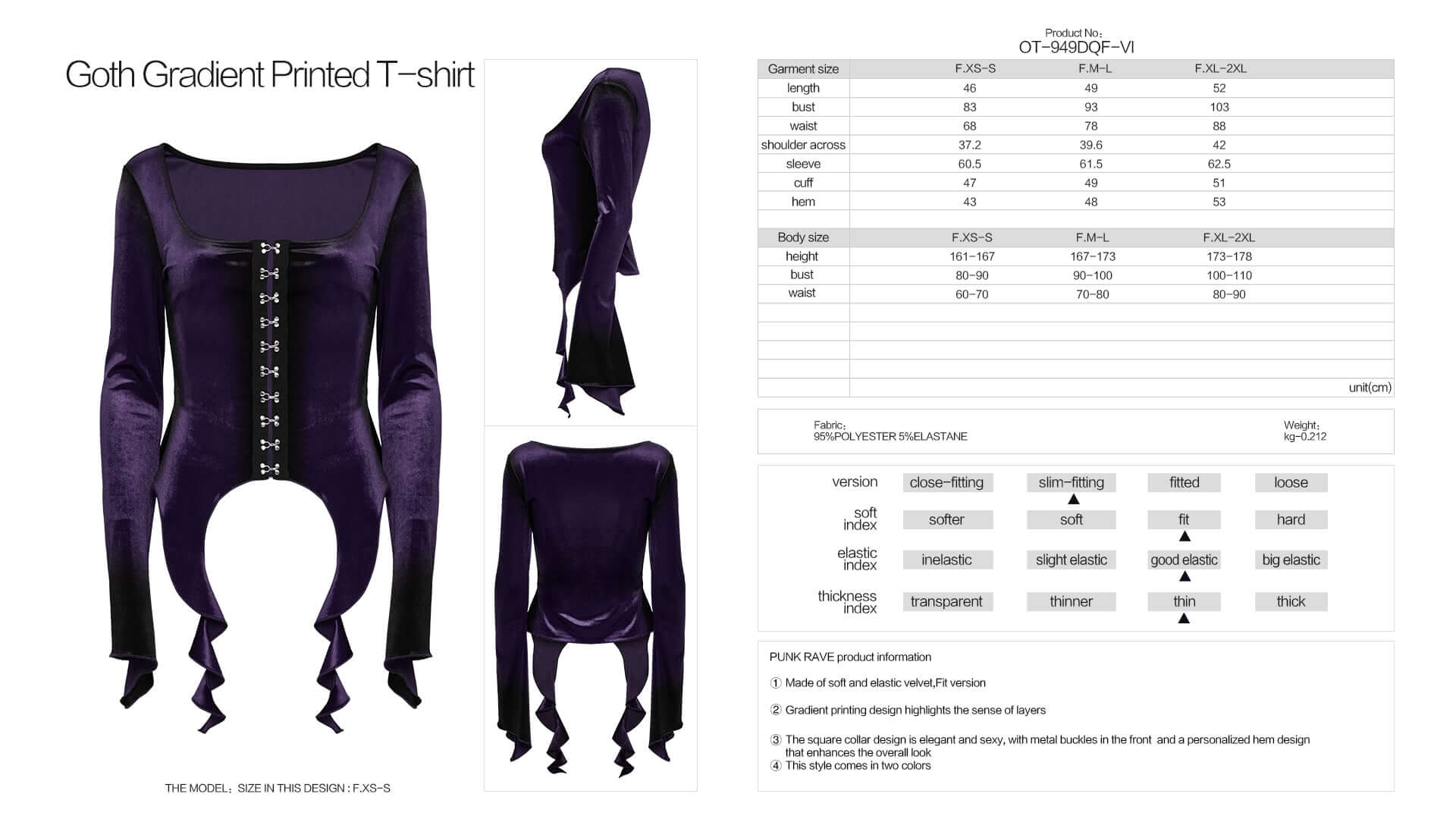 Embrace your edgy side with the Punk Rave Bronwyn Gradient Printed T-shirt! Made of soft and elastic velvet, this fit version showcases a unique gradient printing design that adds dimension to your look. The elegant and sexy square collar features metal buckles and a personalized hem.