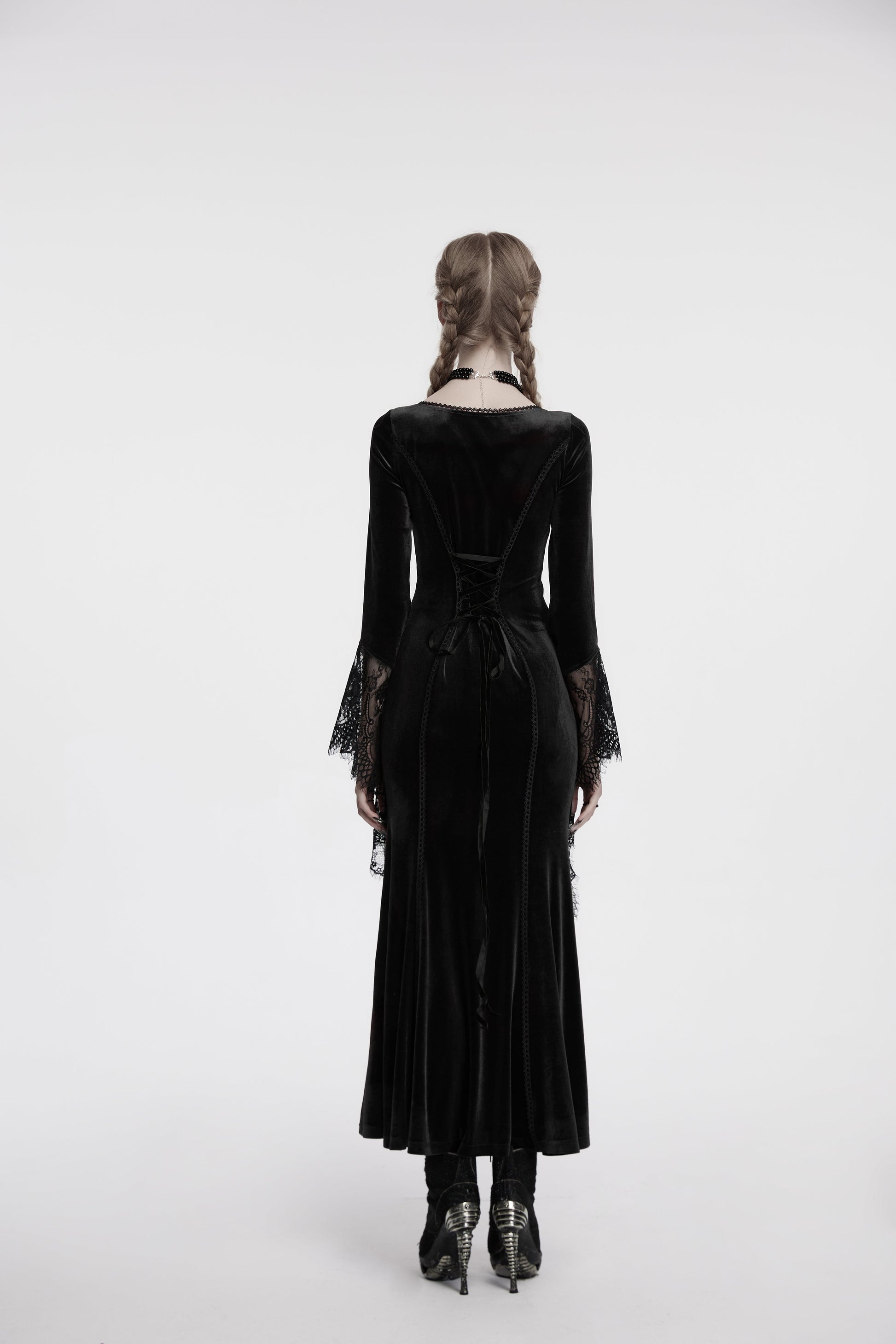 Channel the elegance of the night with the Punk Rave Isolde Velvet Lace Sleeve Dress, a luxurious goth masterpiece designed for those who crave drama and allure. Crafted from high-quality elastic velvet, this close-fitting gown skims your curves while the flowing skirt adds a regal silhouette. The neckline features intricate rose decals for a touch of dark romance, and the flared lace cuffs bring an air of ethereal sophistication. A lace-up corset back ensures the perfect fit, making it as flattering as it is enchanting.