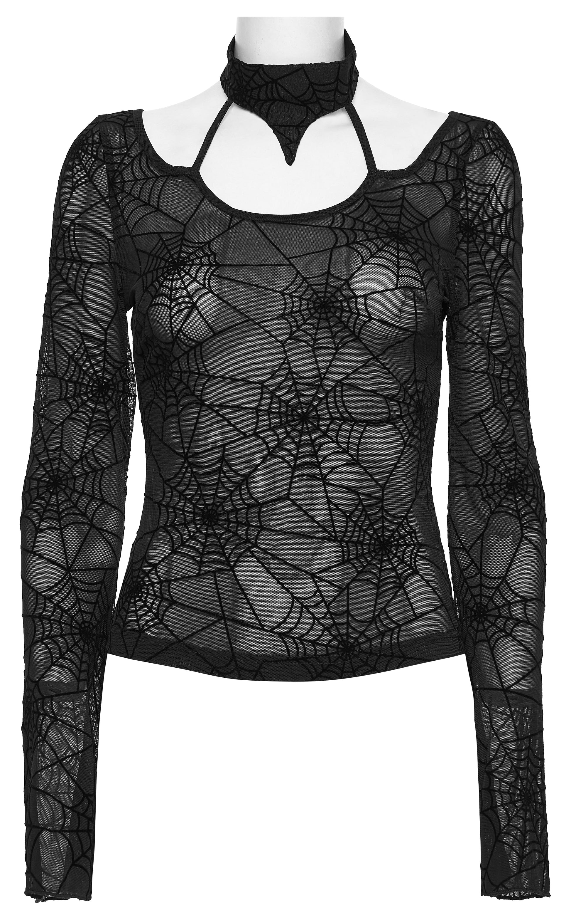 Spin your own web of dark elegance in the Punk Rave Lilith Gothic Spider Web T-Shirt. This alluring sheer mesh top features soft stretch fabric printed with intricate spider web patterns, giving your look a bold and artistic gothic edge.
