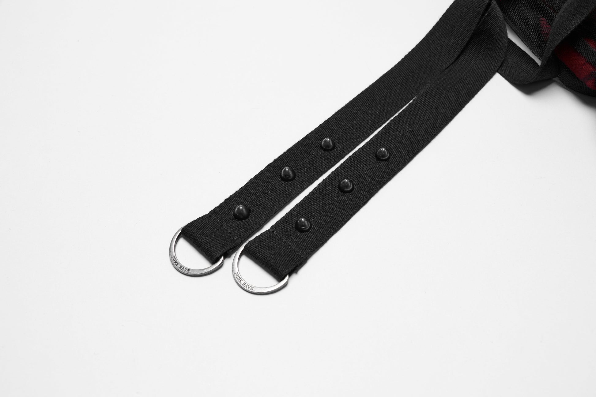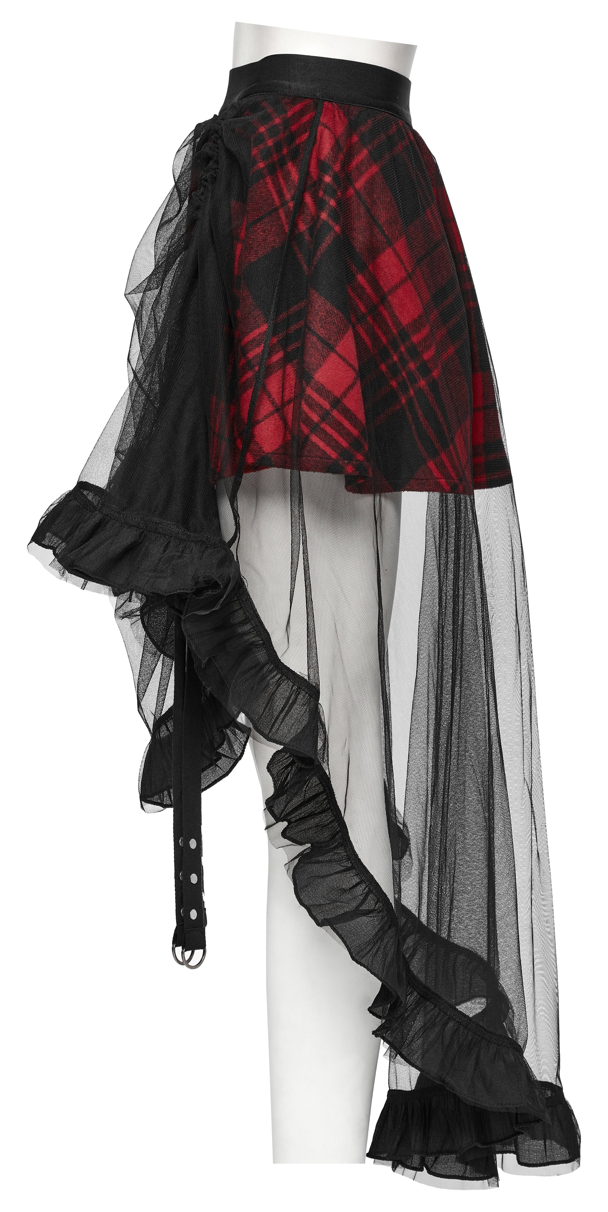 Unleash your rebellious spirit with the Punk Rave Morrigan Mesh Plaid High-Low Skirt, a bold fusion of punk edge and goth elegance. Crafted from thickened red plaid fabric layered with sheer black mesh, this skirt creates a striking high-low silhouette with flowing ruffled edges. The design is elevated with adjustable studded webbing straps on both sides, allowing you to gather the fabric for a custom draped effect and endless styling possibilities. Perfect for statement-making alternative outfits.